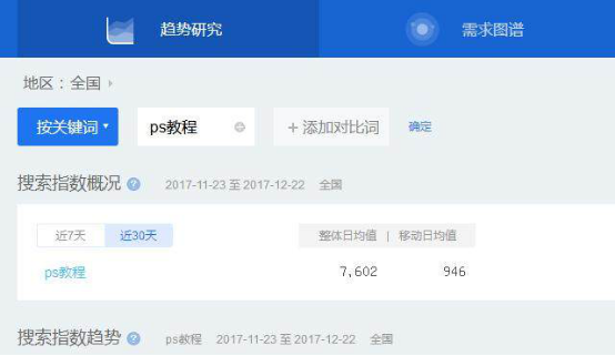 再來看一下百度指數,最近三十天平均每天也有7000+,并且還不包括某寶的搜索指數,由此看來這些教程的需求量很大。