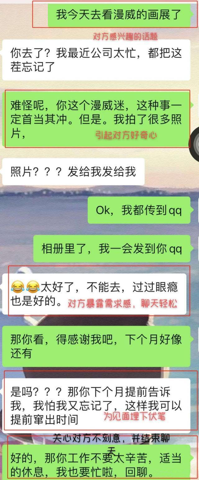 所以我建議,只要保持2-3天一個(gè)簡(jiǎn)短的問候,溝通就可以。期間如果是對(duì)方主動(dòng)發(fā)信息過來,你也可以見招拆招,比如他跟你說工作,那就要想想是不是他的工作出現(xiàn)了什么困難,幫他分析一下,去理解他;或者他說了最近的近況,那你就要看看他是否在生活上出現(xiàn)了問題,要學(xué)會(huì)在言談中,覺察他當(dāng)下的情感需求,并且滿足對(duì)方,讓他產(chǎn)生依賴感跟舒適度。