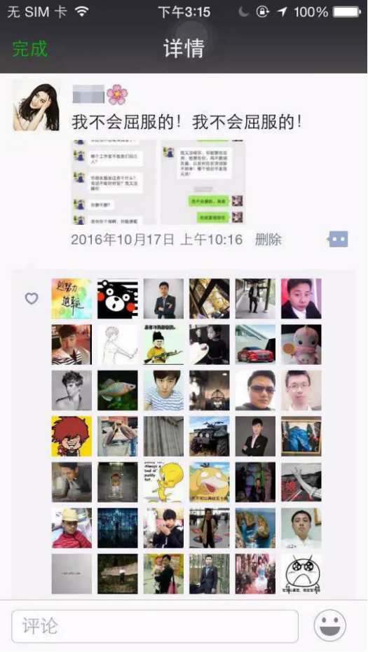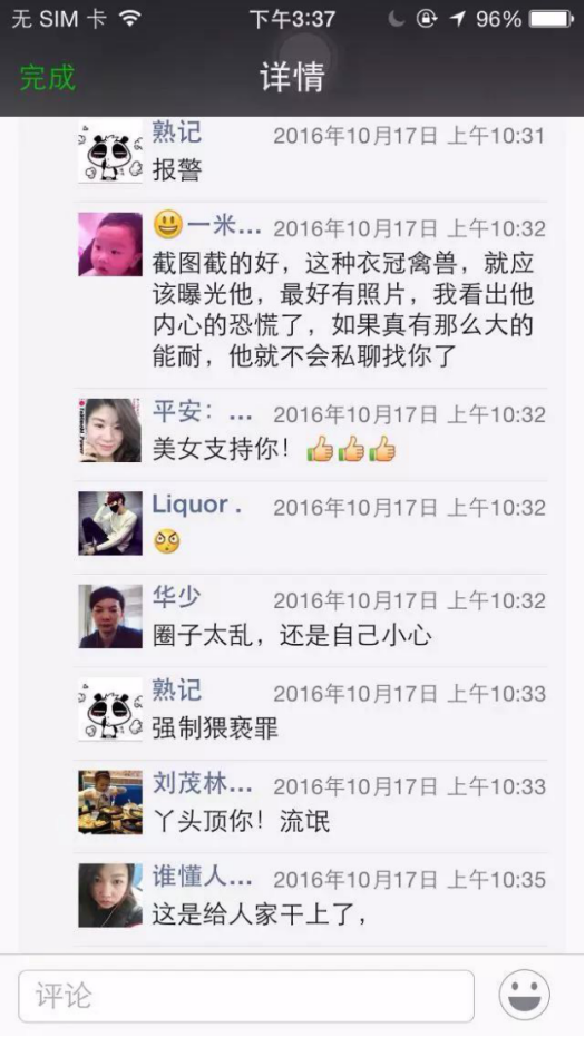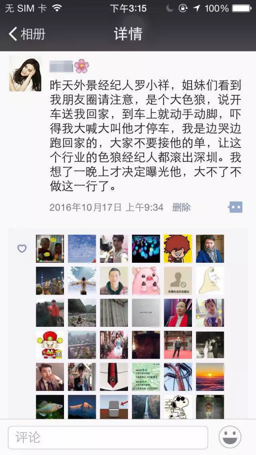2、20天后,劇情轉折,發圈表示經濟人欲潛規則自己,現已走投無路。此時,一定會激起粉絲的憤怒、同情與共鳴??勺孕邪缪萁浖o人,制作如下截圖,使得事件真實可信。點擊即可顯示完整高清大圖。