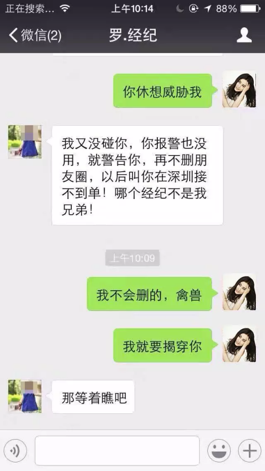第18天:經濟人發微信威脅自己,不從,截圖發朋友圈控訴他。